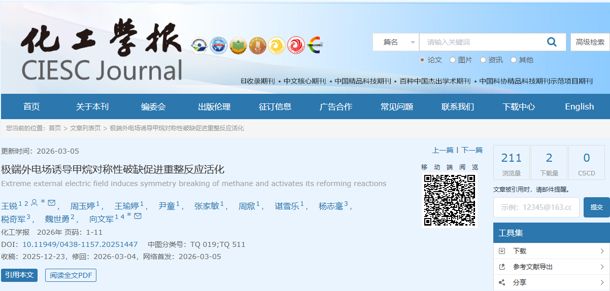 近日,学院塔石人才工程特聘教授王锐以第一作者兼通讯作者在中文领军期刊《化工学报》上发表题为《极端外电场诱导甲烷对称性破缺促进重整反应活化》研究论文,四川文理学院为第一完成单位。论文链接:https://www.hgxb.com.cn/thesisDetails#10.11949/0438-1157.20251447&lang=zh