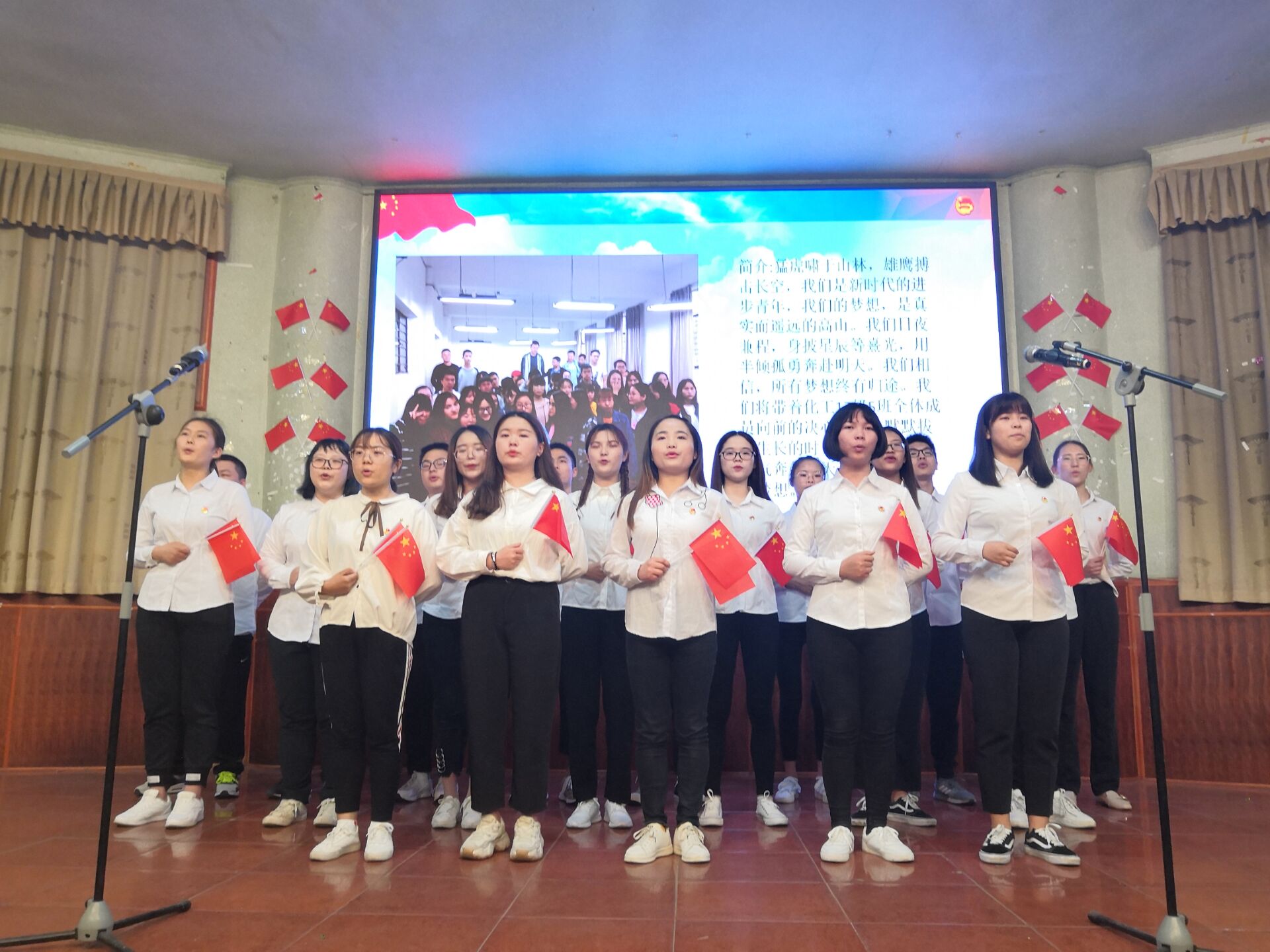 伴随着主持人充满激情的开场白,比赛正式拉开帷幕。比赛中,各支部的代表人员用低回婉转的歌声,展示了在炮火与硝烟的年代,革命先辈威武不屈奋勇拼搏的精神。他们的歌声热血澎湃,宛若怒吼的黄河,在诉说着时代的不幸;他们的歌声铿锵有力,宛若高亢的雄鹰之声,吟唱着不屈的精神和坚定的意志。一首《团结就是力量》,这力量是铁,这力量是钢,让同学们回忆起革命先辈们一起反帝反封建的峥嵘岁月。时代在召唤,在座的同学们都是《龙的传人》,作为当代青少年,新时代中国特色社会主义的接班人,大家更应扛起时代的重担,勇于承接时代赋予的新使命。