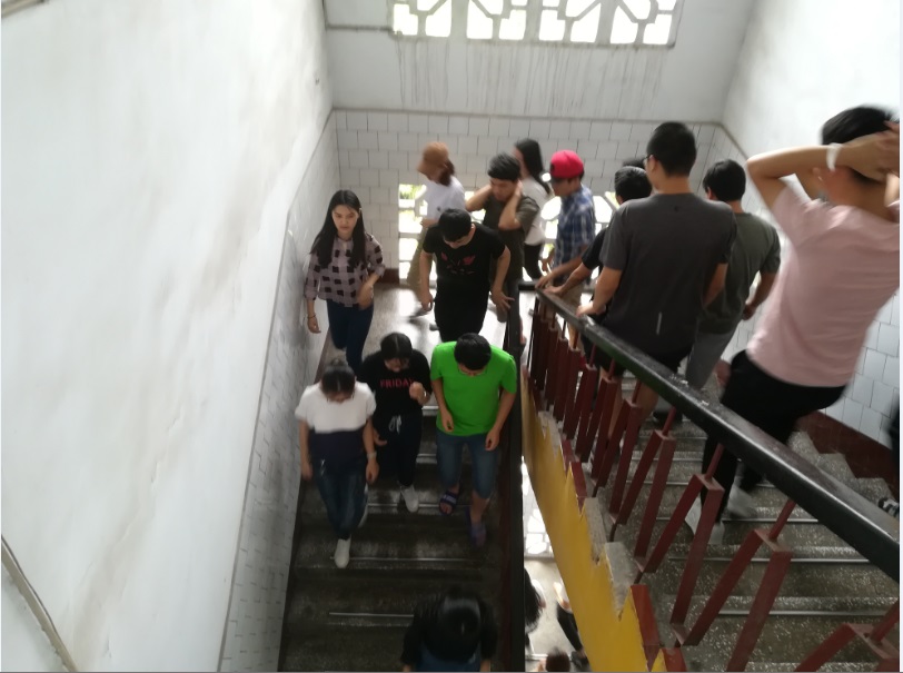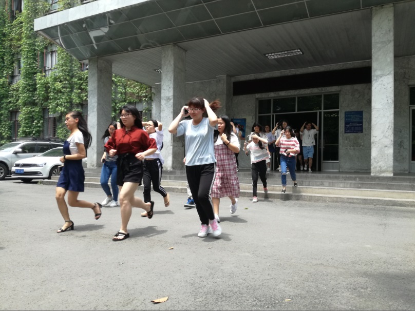 本次演练模拟了上课期间突然发生地震,正在上课的老师和同学们紧急撤离的过程。1240,“地震”来临,警报拉响。在一教楼15楼的“上课”的同学们迅速做出反应,大家双手抱头,快速而有序的撤出教学楼,在升旗台前空地集结。整个撤离过程约2分钟17秒。