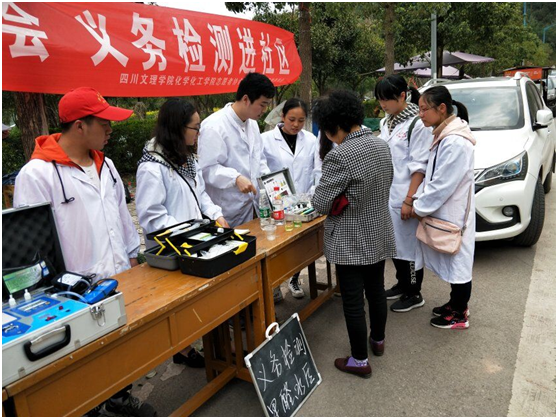 本次志愿服务活动是以国家资助体系受助同学为志愿者主体,以义务检测和远程家教服务为主要内容。15:00,志愿服务活动在学府雅苑门口拉开序幕。志愿者们在小区内宣传化学食品相关知识,为居民提供以甲醛为主的室内空气、家居水质检测。为了充分发挥学院数理化优势,减轻家长负担,本次志愿服务活动以“川文理化工之声”微信公众号为平台推出了“你问,我答” 远程网络家教活动,针对中小学生的数理化等学习问题,同学们在线答疑解惑。活动结束后,志愿者们对已检测的居民进行登记,为存在问题的住户提供改善方案,并进行后期跟踪,确保问题得到解决。