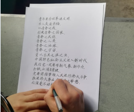 本次比赛以党的十九大精神、习近平新时代中国特色社会主义思想和学习青年习近平为主题,分为钢笔字和粉笔字两组。钢笔组根据指定的比赛内容为书写材料,自选字体在限定的时间内进行现场创作,评委们根据作品评定标准进行评定,遴选出优秀作品;粉笔组则由抽签的形式随机抽取比赛内容,自选字体进行作品创作,根据评议小组的粉笔字打分情况表,统计出每位参赛选手相应平均分,最终确定优秀作品。在比赛过程中,学院党总支副书记屈川、学院学工办主任兼团总支书记彭波莅临现场,指导了工作。