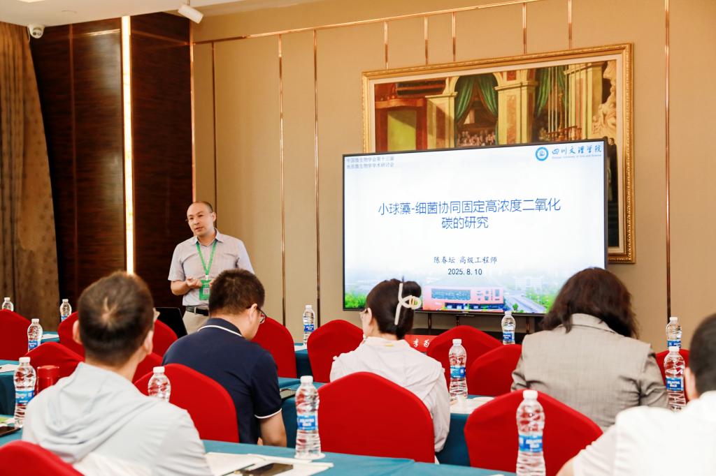 学院陈春坛教师参加了会议,并在分会场作题为“小球藻-细菌协同固定高浓度二氧化碳的研究”的专题报告。报告系统阐述了小球藻与功能细菌的共生固碳机制,深入分析了协同体系对高浓度CO₂的固定效率、影响因素及代谢调控策略,并展示了该技术在工业尾气处理与低碳转化领域的应用前景。报告内容因其创新性、科学性及实践价值,获得了参会专家学者的广泛关注与高度评价。
