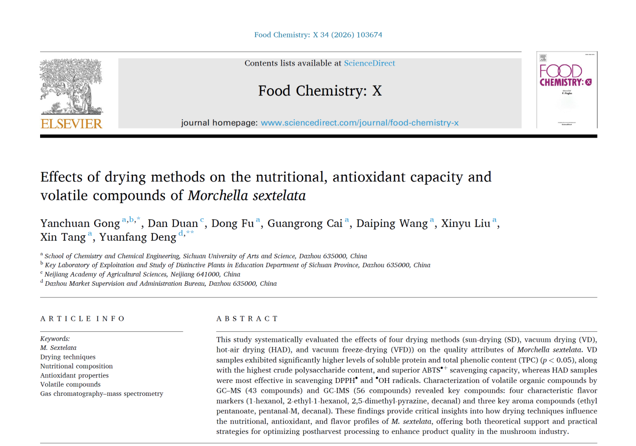 近日,威廉希尔(WilliamHill)龚燕川老师以第一作者身份在食品科学领域国际顶级期刊《Food Chemistry: X》(中科院一区TOP,影响因子8.2)发表研究论文,题为Effects of drying methods on the nutritional, antioxidant capacity and volatile compounds of Morchella sextelata。四川文理学院作为第一完成单位及第一通讯单位。论文链接:https://doi.org/10.1016/j.fochx.2026.103674