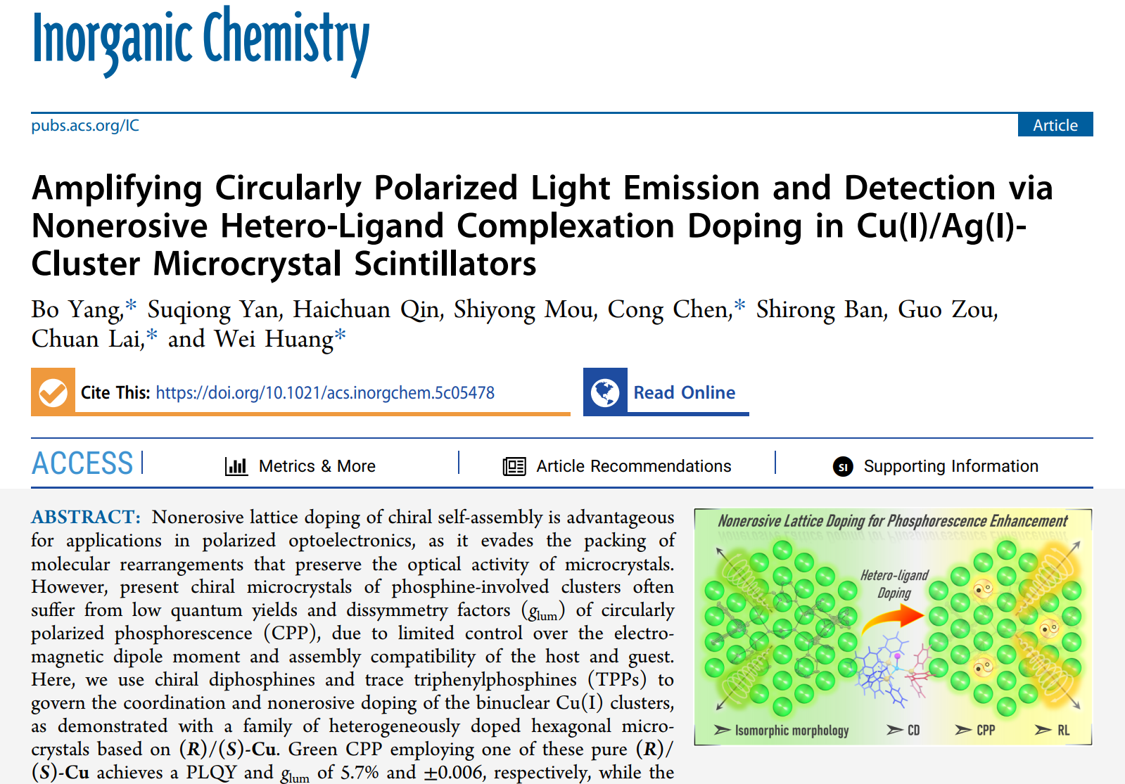 近日,英国威廉集团官网青年教师杨波博士以第一作者兼通讯作者身份,在自然指数期刊、无机化学与核化学领域一区Top期刊《Inorganic Chemistry》上发表题为《Amplifying Circularly Polarized Light Emission and Detection via Nonerosive Hetero-Ligand Complexation Doping in Cu(I)/Ag(I)-Cluster Microcrystal Scintillators》的研究论文(DOI: 10.1021/acs.inorgchem.5c05478; https://pubs.acs.org/doi/10.1021/acs.inorgchem.5c05478)。该成果以四川文理学院为第一完成单位,南京大学威廉希尔(WilliamHill)、配位化学全国重点实验室为共同通讯单位。