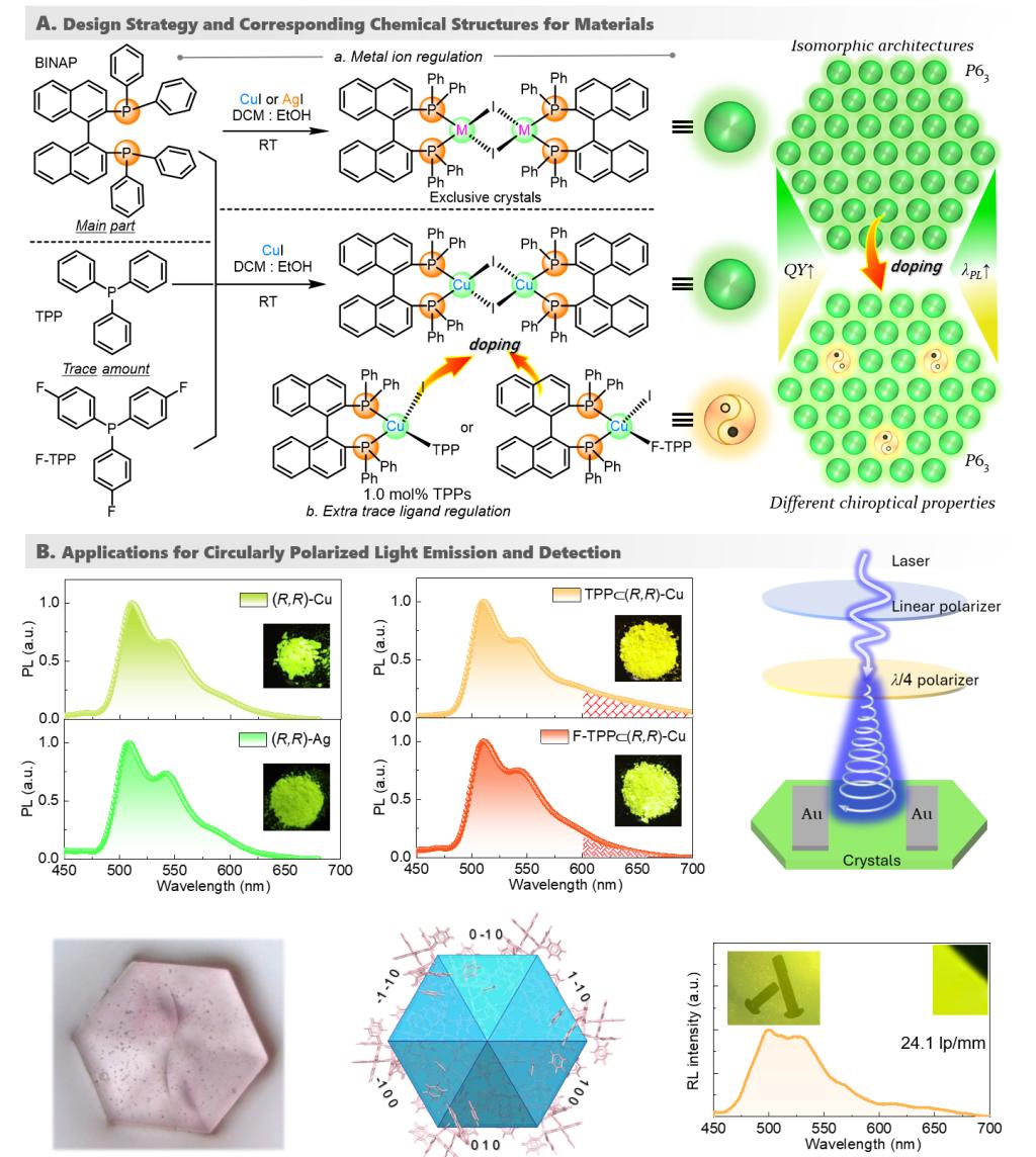 手性磷光Cu(I)/Ag(I)配合物因其在圆偏振发光领域的应用前景而备受关注。在几何规则的晶体中,材料的形貌对光学增益和偏振性质具有重要影响,使其在偏振光电子学中展现出重要价值。该研究通过调控金属离子并采用非侵蚀性配位掺杂策略,成功合成了一系列Cu(I)/Ag(I)双核簇。研究发现,非侵蚀晶格掺杂能够形成第二发射中心并引发二次电荷转移,从而重构激子辐射通道,显著提升发光量子效率,并实现圆偏振发光颜色的有效调控。基于该材料优化的光电器件和薄膜,在圆偏振光检测与闪烁体成像中表现出高响应性和优异的辐射发光性能。