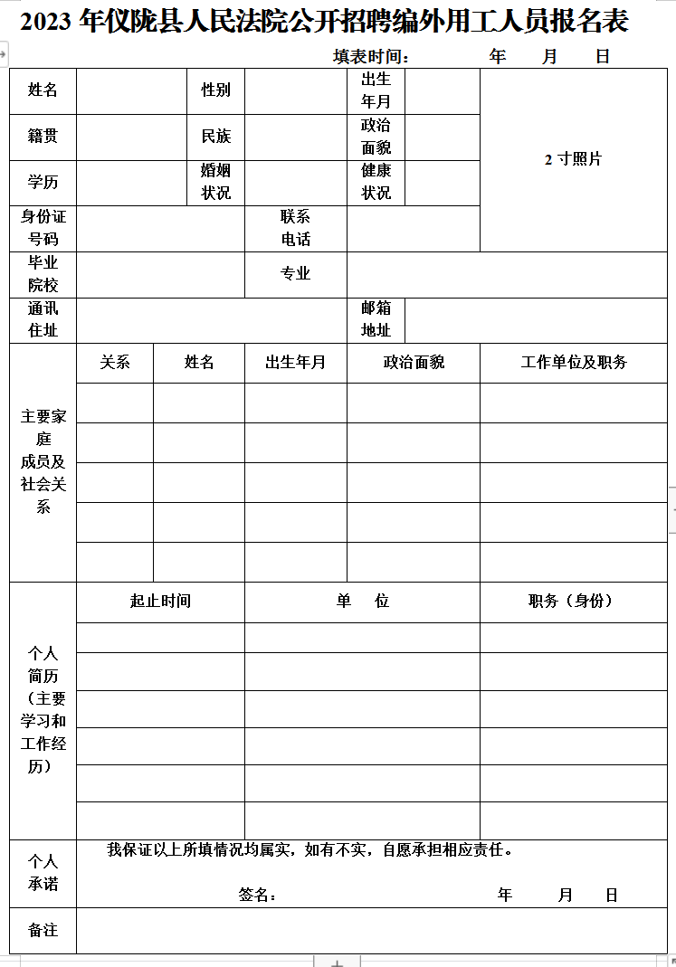 1)《2023年仪陇县人民法院公开招聘编外用工人员报名》附后,本人签字);