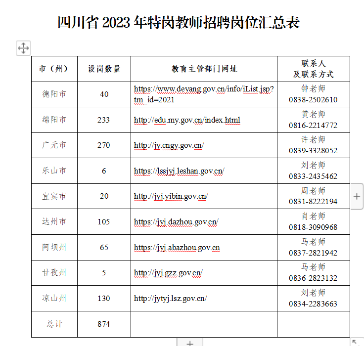 2023年四川省共招聘特岗教师 874名,具体岗位设置信息、岗位报名条件及要求详见各市(州)教育主管部门网站(见附件)。